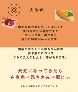 ①元気のない時のお肉やお魚は赤ちゃんにはNG