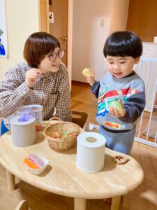 サロンでは、子どもの発達を促すおもちゃや環境を整え、おいしいものを食べたり、おしゃべりしたりして、気楽に過ごせる空間を提供しています。