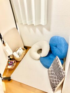 8畳ほどの小さな保育スペースの中では、お子さんに目が届きやすく、ワンオペで複数の子をみなければならない方でも、ある程度余裕をもって保育することができます。何よりプラスワンで私が保育に当たるので、おうちの方は少し休みながら子どもをみられると思いますよ!