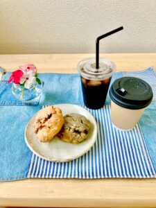 6畳ほどの飲食スペースには、飲食物の持ち込みが可能。おやつとコーヒー、様々なお茶類が用意してあり、おいしいものを食べたり飲んだりしながら、ほっとひと息つくことができます。また授乳・おむつ替えスペースもあり、小さなお子さんのいる方でも安心して過ごせる環境が整っています。